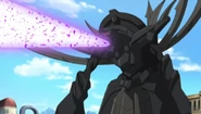 After Gaia had been revived with Doll inside of it, erupting from beneath the Holy Land Arena in a huge beam of destructive energy, Kenshi faces off against them, and to everyone's astonishment, was able to fight with them on equal terms. Kenshi's weapon, a large stone obelisk more massive than the Swan but compressed down with his power to be used as a sword by his Seikijin, did little to no damage to Gaia. The tables are later turned when Babalun merges with Gaia, and then fused with the Shield of Gaia, a weapon that it had wielded, that acted as both defense and offense. After fusing with its shield, Gaia took a full barrage from the Havoniwan train's dozens of cannons with zero damage, and with a single swipe of its mouth laser destroyed the flying tower, Babel, which crushed the train from its crash. The Shield increased Gaia's defenses, and granted it incredible regenerative abilities, allowing it to overpower Kenshi. The latter decides to go all out while Gaia continued to regenerate. Gaia kept attacking Kenshi, both with its laser and from shifting its body, extending its arms into whips to hit him from a distance.